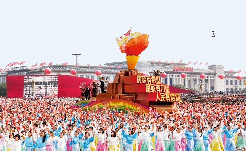 2019年10月1日,慶祝中華人民共和國成立70周年大會(huì)在北京天安門廣場(chǎng)隆重舉行。這是群眾游行中的“凝心鑄魂”方陣。 新華社記者 李欣/攝
