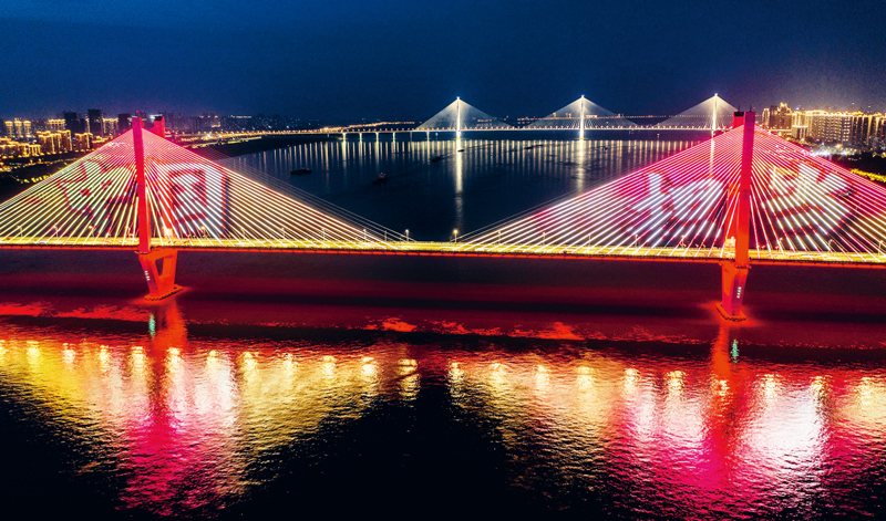在抗擊新冠肺炎疫情的斗爭(zhēng)中,中國人民萬眾一心、眾志成城,凝聚起強(qiáng)大合力,展現(xiàn)了中國力量、中國精神、中國效率。圖為2020年5月2日晚,湖北武漢長(zhǎng)江二橋燈光秀打出的“中國擔(dān)當(dāng)”畫面。 中新社發(fā) 趙廣亮/攝